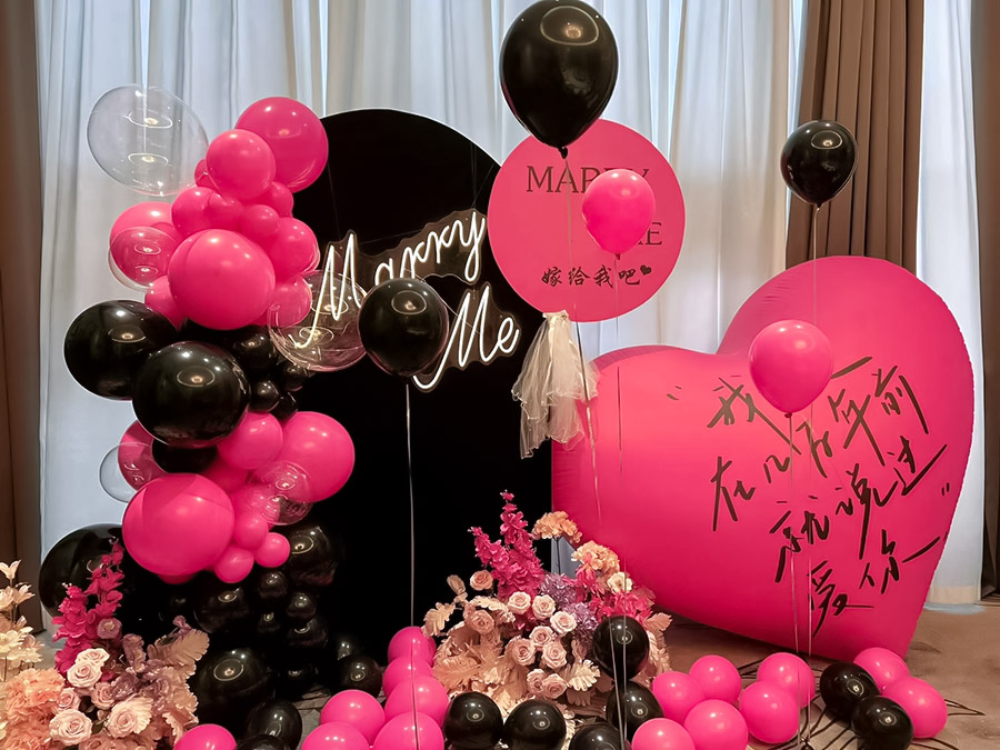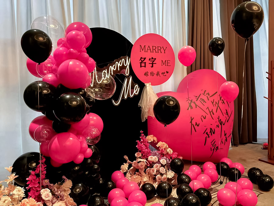 玫红色黑色气球求婚布置超大爱心求婚气球背景