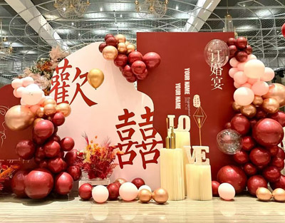 红色的主题,热情饱满,气球那圆润的姿态可以展现订婚宴的浪漫与激情!用红色的气球布置订婚宴会场,让更多
