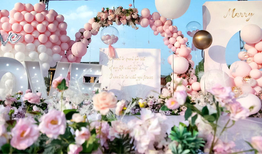 户外婚礼的实战案例,采用粉白色系的空飘气