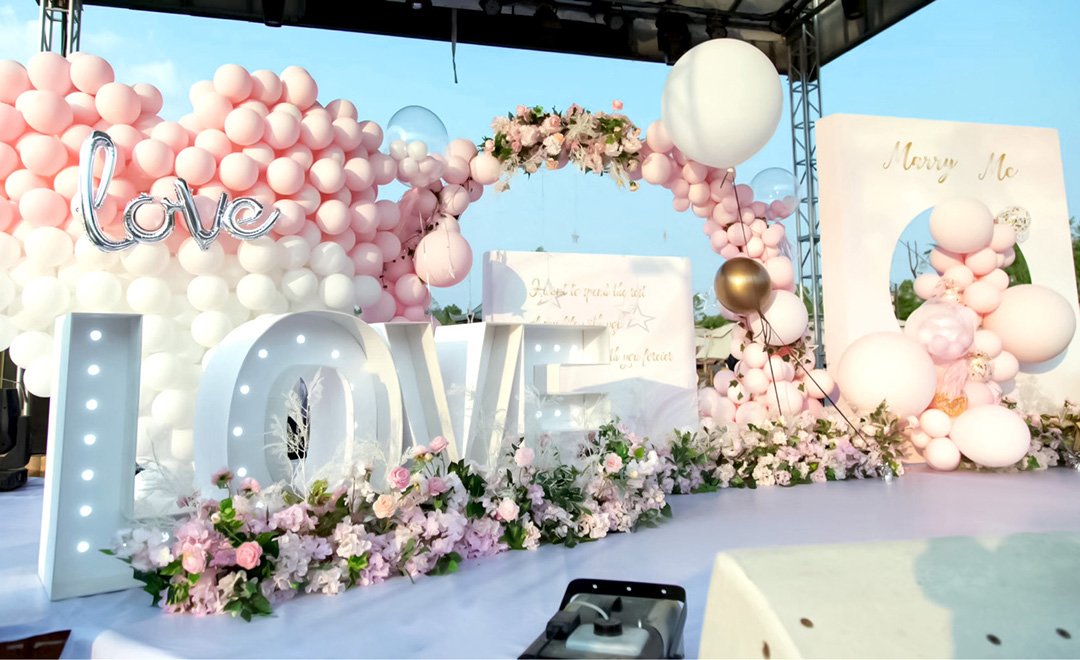 户外婚礼气球布置效果非常棒的飘空气球和立体爱心