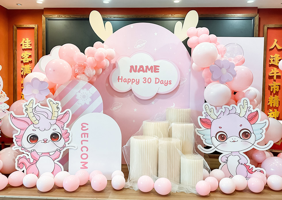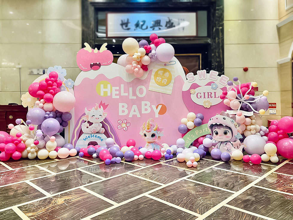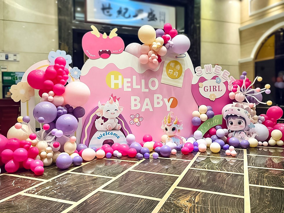 在这特别的龙年,迎来了小公主的满月庆典。场地布置以柔和的粉色为主色调,象征着龙的力量与宝宝的纯真。高高挂起的龙形KT板,营造出既庄重又温馨的氛围。背景墙上以卡通龙与祥云图案为主,搭配精致的花卉与蝴蝶结装饰,象征着宝宝在祥瑞之年带来的好运与幸福。每一处的精心设计,都是为了纪念这个充满祝福与希望的特别日子,让龙年小公主的满月宴会璀璨耀眼,留下一段美好而珍贵的记忆。