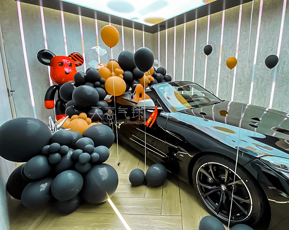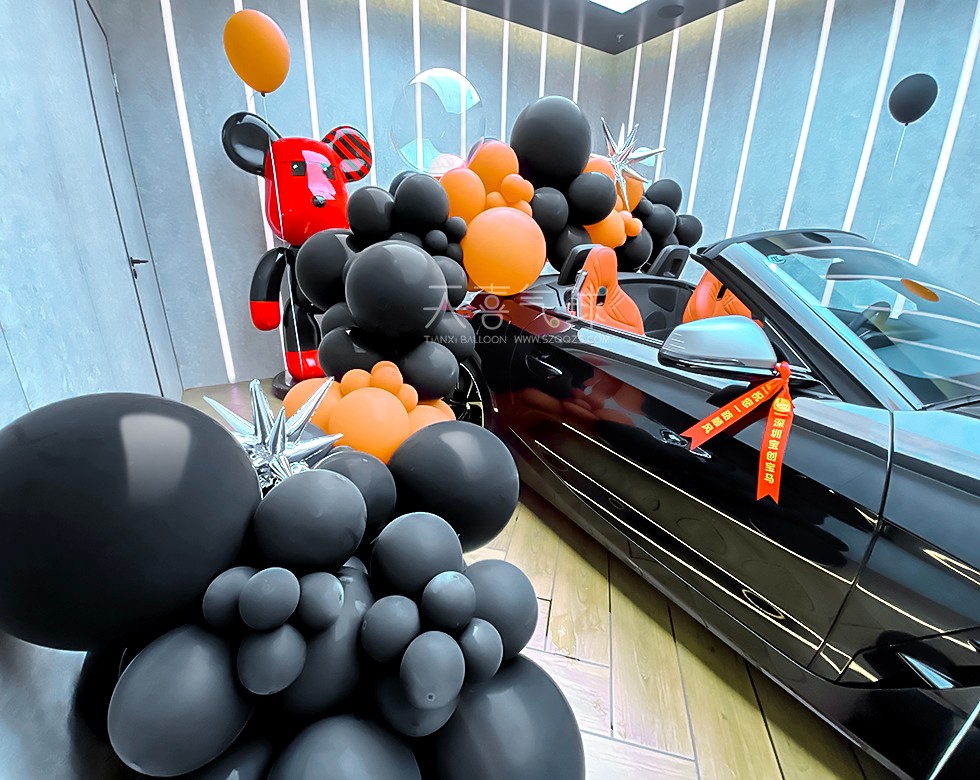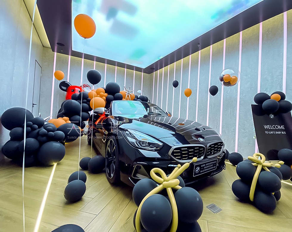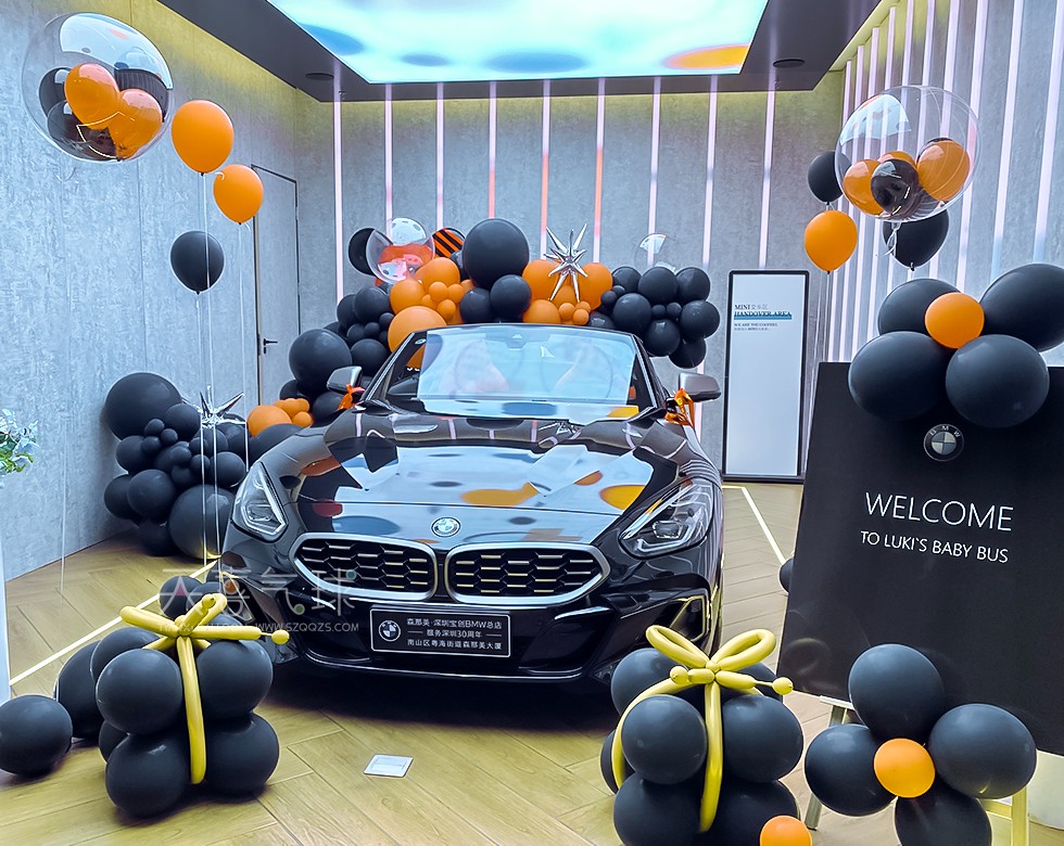 宝马Z4提车仪式布置——黑橙气球与豪华驾驭的完美结合