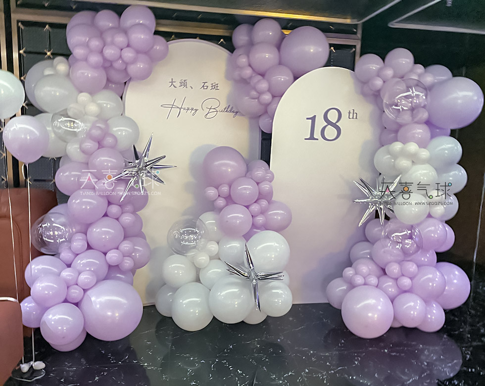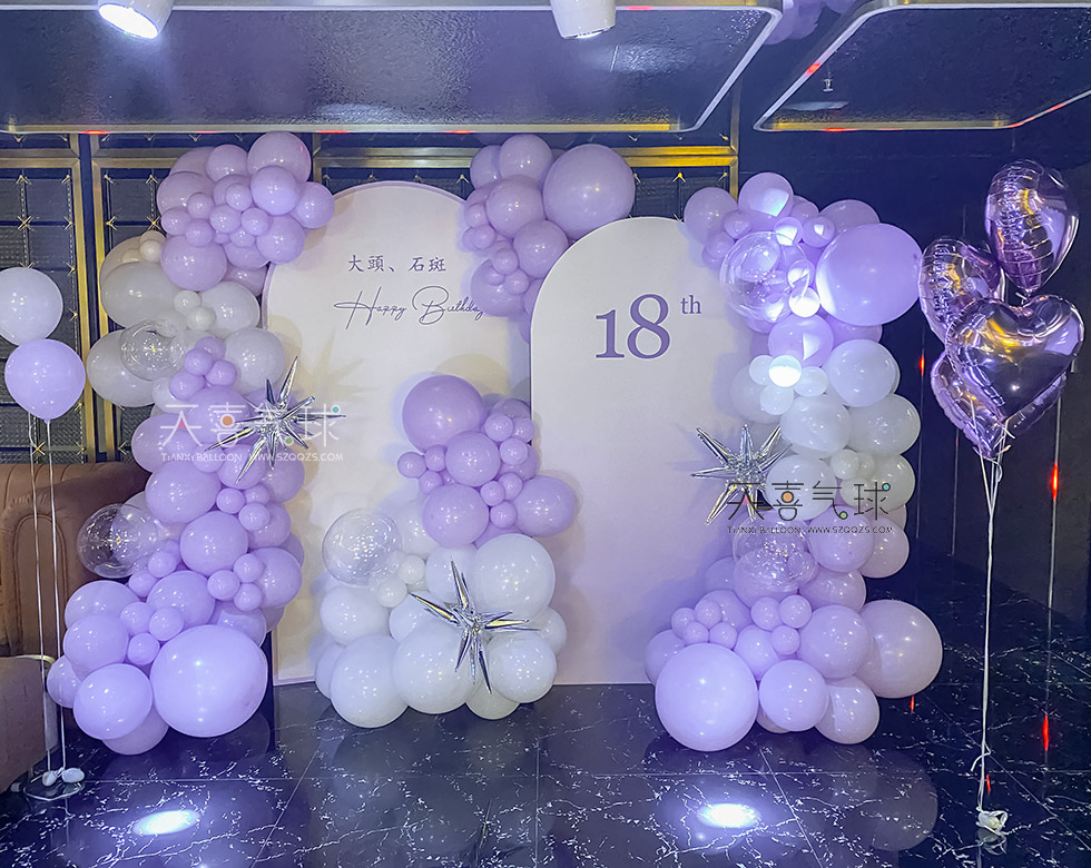 KTV 18岁生日派对布置案例,以紫色马卡龙气球为主,搭配金色、白色点缀,营造优雅与梦幻兼具的庆生氛围。香芋紫爱心氦气球,打造专属拍照打卡区。