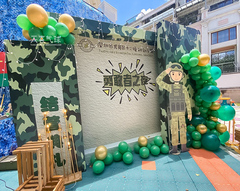 我们选择了多种绿色系的气球,包括深绿、草绿和墨绿等不同色调,通过气球拱门、气球柱和气球背景墙的设计,打造出充满活力与希望的氛围,象征着孩子们在勇敢之夜中的成长和自信。