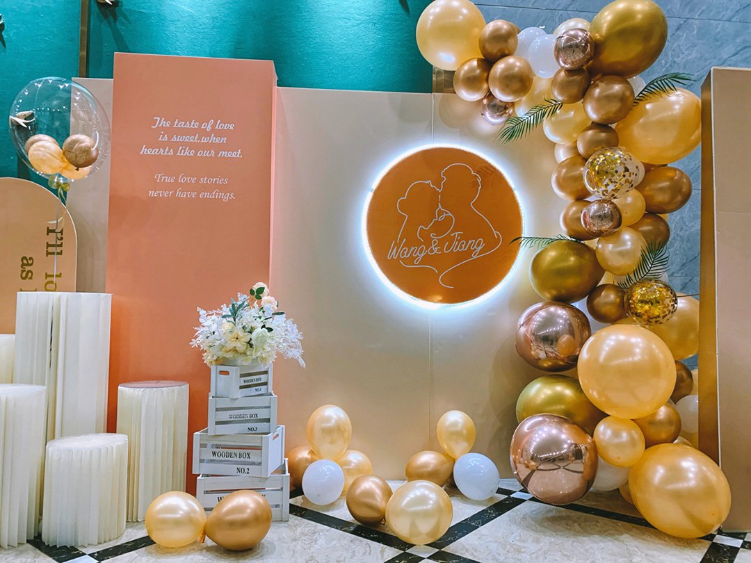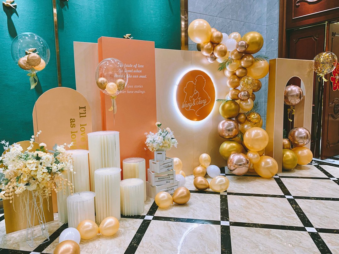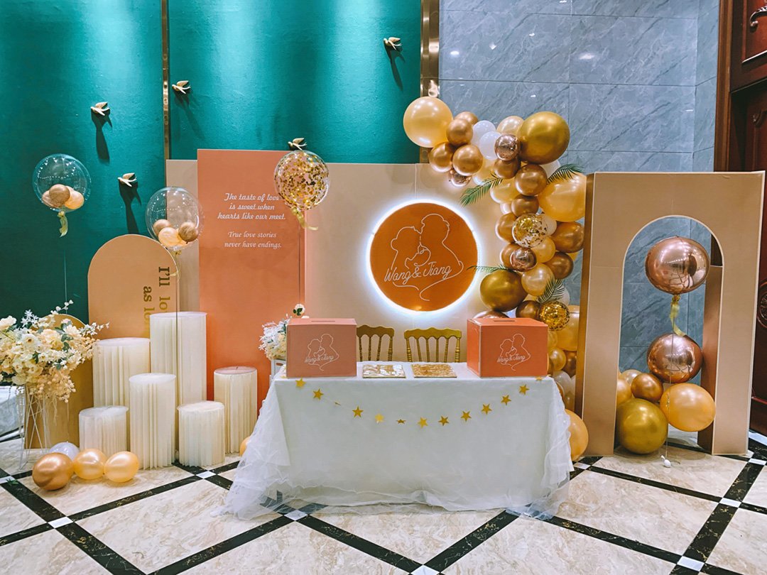 婚礼签到台背景墙布置香槟金结合玫瑰金气球